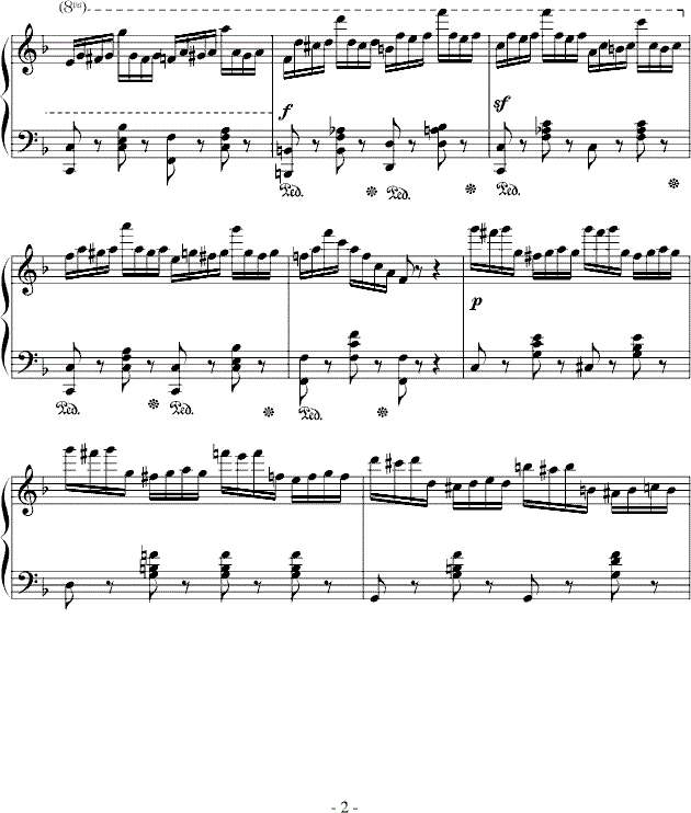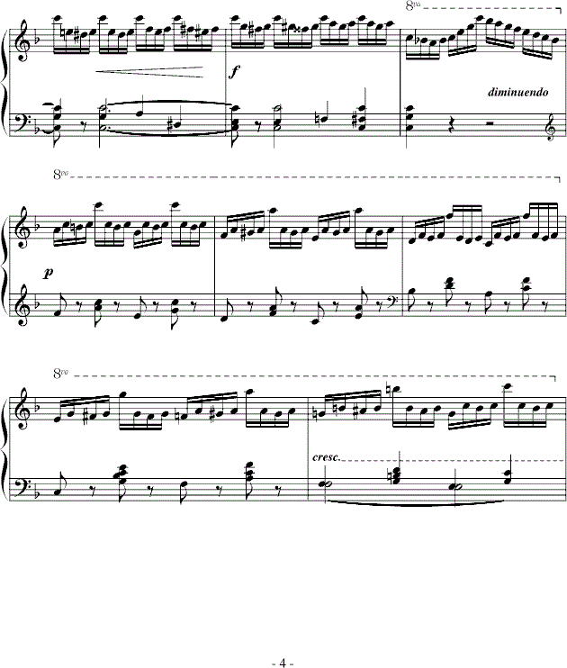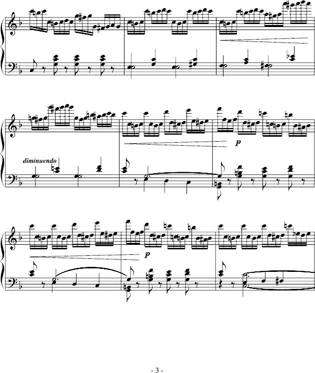 分声练习 钢琴音乐多声层次的演奏含有复杂的控制技术,特别是在复调音乐中,每个独立声 部都有其自己的进行,自己的分句、奏法、自己不同的音色、力度处理等等。它们既有横向旋律关系,又有纵向的和声、时位关系;许多时候一只手要担任两个或两个以上声部的演奏,有时候又需要两只手交替来完成一个声部的演奏,总之,钢琴音乐的多声层次要求演奏者头脑里对各声部非常清晰熟悉。因此,有时仅仅分手练习还不够,极有必要作更多更精细的分声练习。