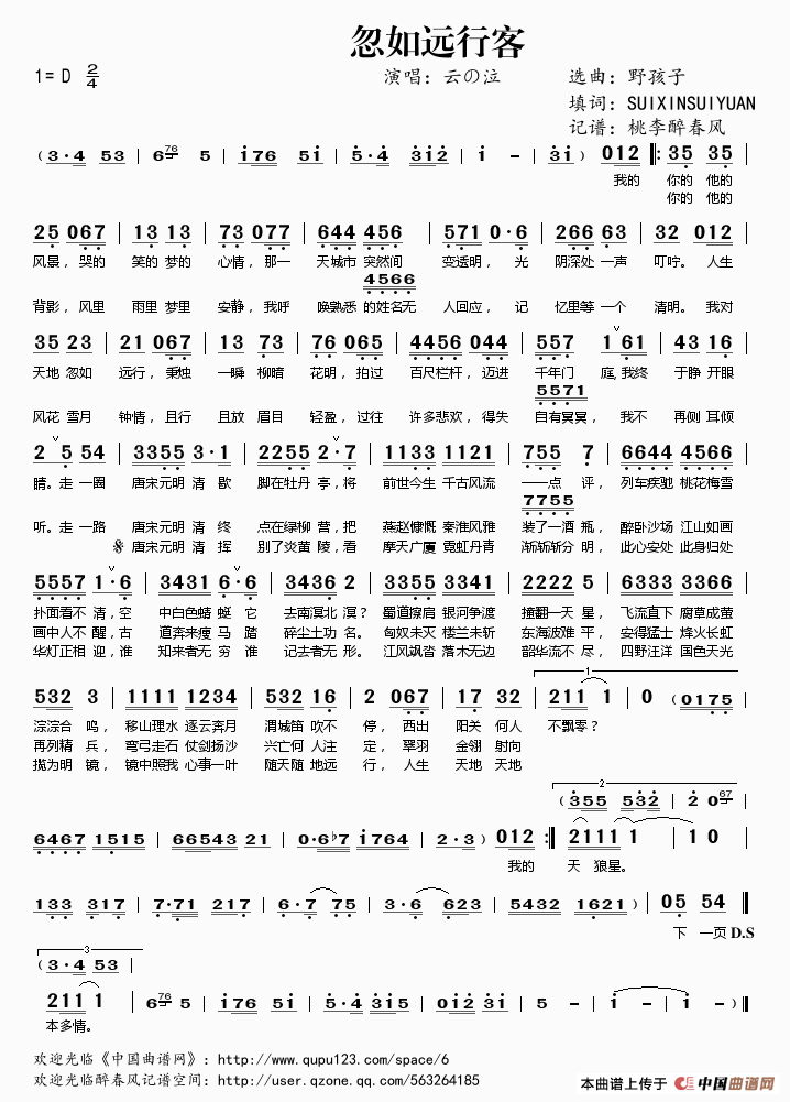 歌名:忽如远行客简谱
