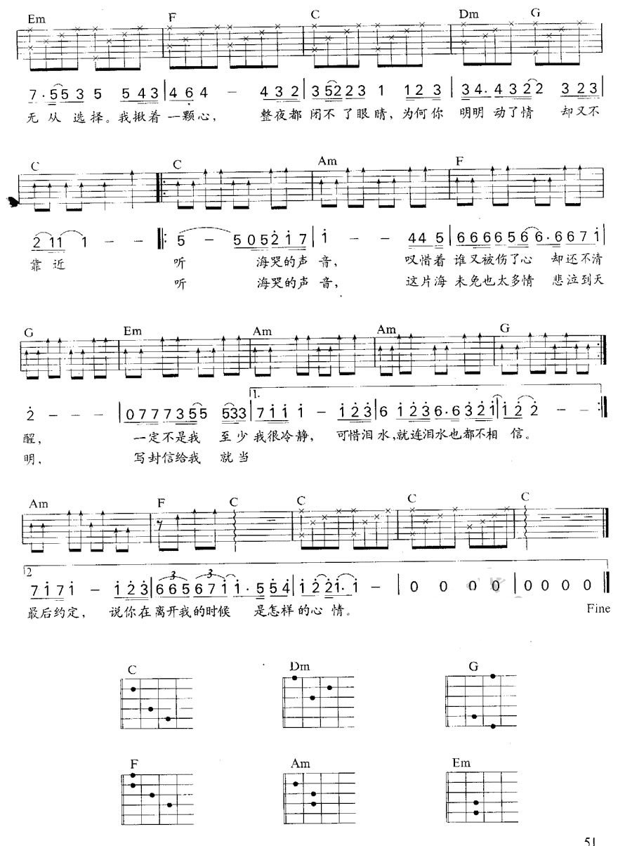 《听海》收录于1997年6月张惠妹发行的第二张个人全新专辑《BAD BOY》,由著名音乐人林秋离、涂惠元继续为阿妹量身打造又一抒情力作。这首歌排在曲目的第五首,发行最初并非是作为主打歌,但因为受到歌迷出乎意料的热烈欢迎,迅速成为流行经典。被如张学友、魏雪漫等歌手多次翻唱。以下是为专门您整理的:张惠妹听海C调吉他谱。希望您会喜欢。