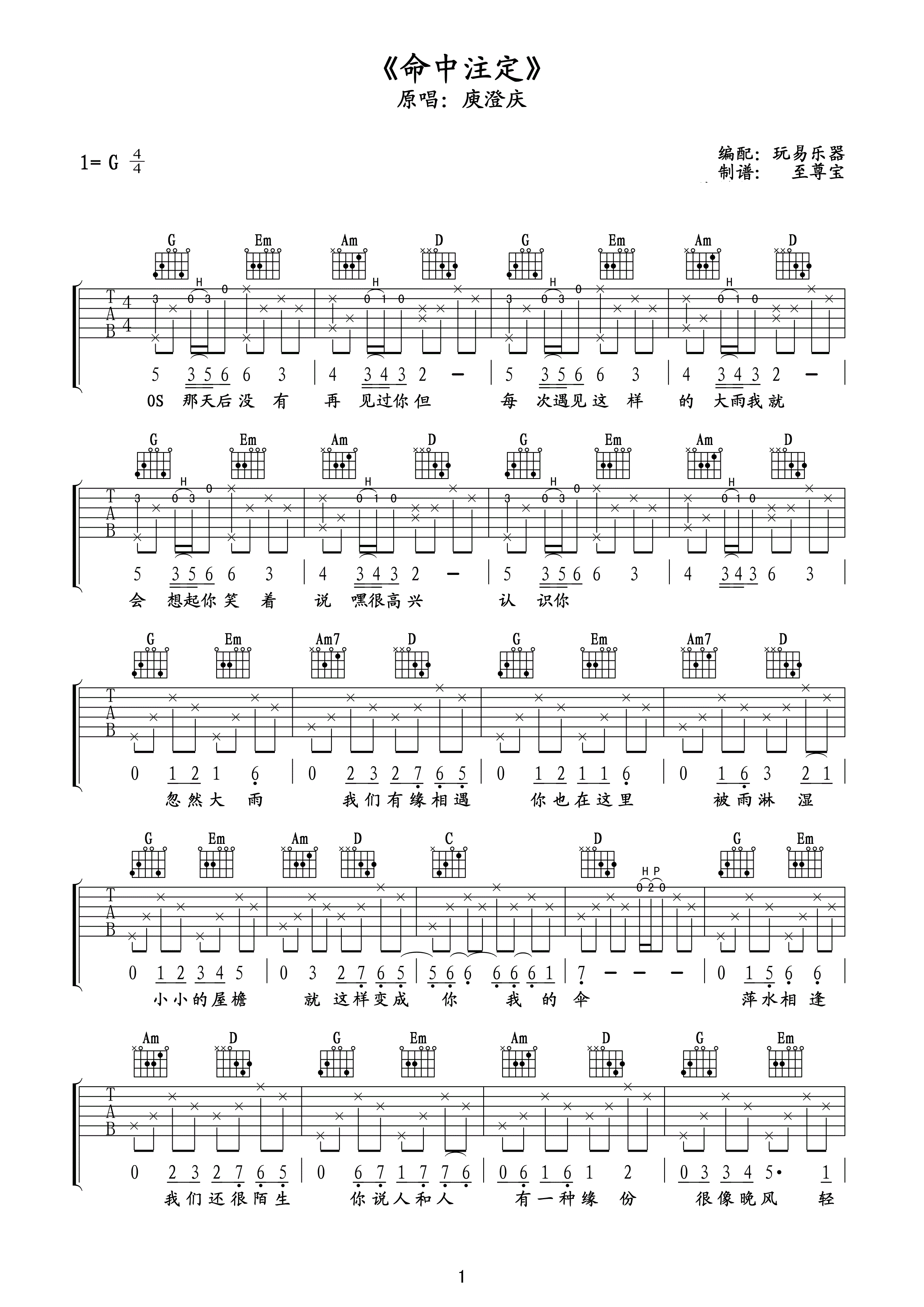 以下是为专门您整理的:命中注定G调吉他谱 庾澄庆。希望您会喜欢。