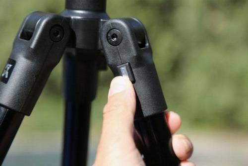 需要注意的是,在这款脚架最下面有一个脚管锁定装置,当把这个开关上向推时,就可以把脚管从最下方开始收起。
