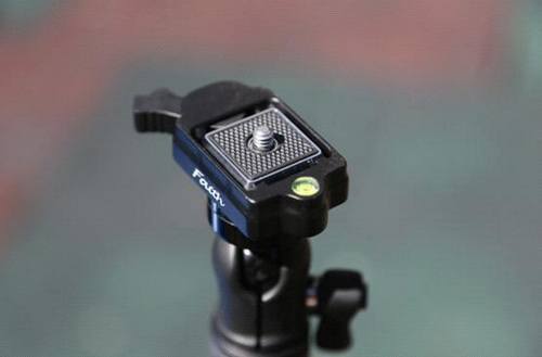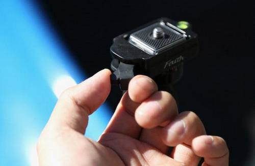 可以看到厂商还贴心的在云台上加装了水平仪,这样可以方便的让摄影师调整地平。这款云台还配备了标准的快拆板,可以方便的安装相机,云台正面还写有Faith的英文标示。