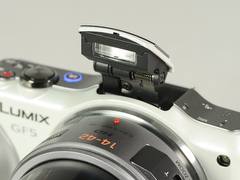 DMC-GF5的套机是一款可伸缩的饼干电动变焦镜头“LUMIX G X VARIO PZ 14-42/3.5-5.6 ASPH. POWER O.I.S.”,该镜头总长约26.8mm,采用电动沉胴式镜头结构,可与相机机身电源联动,开启相机电源后即开始待机状态,关闭相机电源后将以0.5秒的速度收起镜头,实现镜头的便携性与轻量化,表面采用纳米涂层,可有效减少眩光及鬼影的产生。
