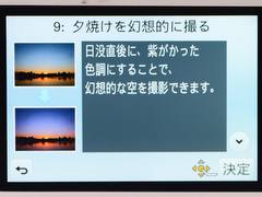 场景指南功能可以像杂志或写真集那样选择喜欢画面效果进行拍摄,并提供了23种画面效果。此外,通过设定画面还能够在添加效果之前的照片和之后的照片之间进行对比,让画面效果一目了然。