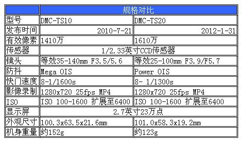 从对比上不能看出主要在像素、防抖、镜头三方面,像素上提升200万像素,就像素值而言,TS4也无法与之相比。防抖方面从Mega OIS升级到Power OIS,两者原理相同,但Power O.I.S增强了防抖效果,拥有Mega O.I.S两倍的校正能力。镜头虽然光学变焦倍数仍是4,但广角端大有扩展,达到25mm,这也是TS4都不具备的(TS4广角端:28mm)。