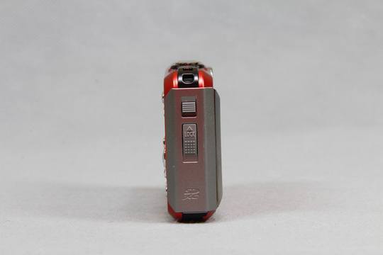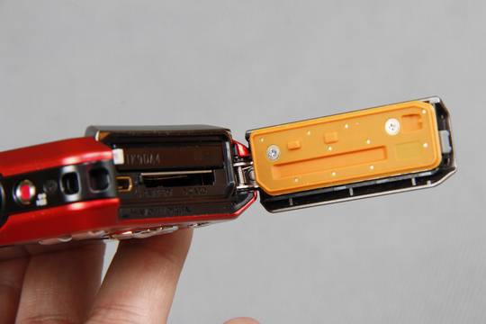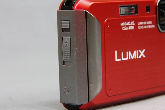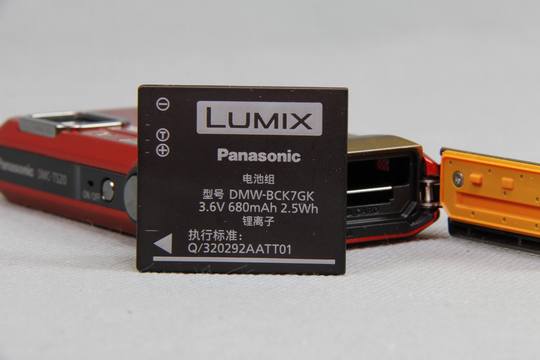 与一般数码相机不同的是相机的电池、存储卡仓设计。松下TS20将数据接口、电池仓、存储卡槽都设计在侧面盖内,仓盖外设计有LOCK锁,该锁钮向上推便将侧盖锁上,打开时需要先将该锁向下拨,在按上面开盖按钮才能打开。虽然看起来比较麻烦,但同样这也是出于防护需要。该机支持SD、SDHC、SDXC存储卡,电池为680mAh的DMW-BCK7GK。