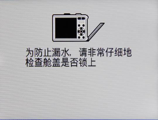界面上松下TS20又与普通相机有什么不同吗?这款相机开机时会有提示,让用户注意侧面仓盖是否盖好,防止漏水。