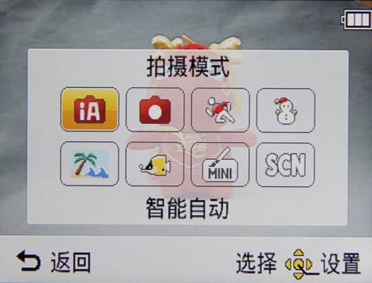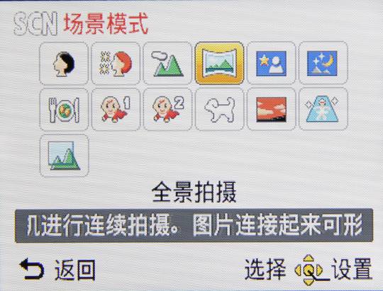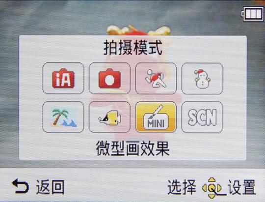 松下TS20 按下MODE模式键可以选择智能自动、标准图像、运动、雪景、海滩冲浪、水下、微型画效果、场景模式。而在摄影场景模式中包括:肖像、柔肤、风景、全景拍摄、夜景肖像、夜景、食物、宝宝1、宝宝2、宠物、日落、高感光度、防玻璃反射。整体来看比较有特色的是微型画效果和全景拍摄,后文中小编会进行实拍。