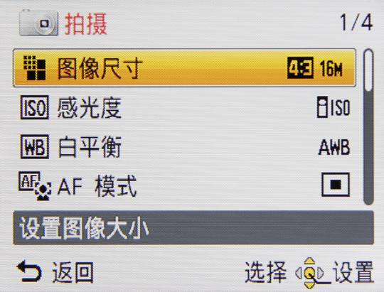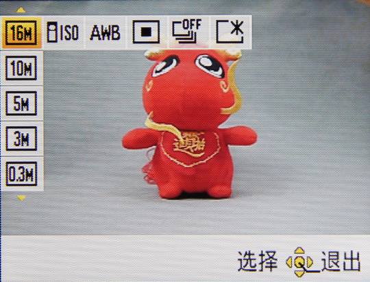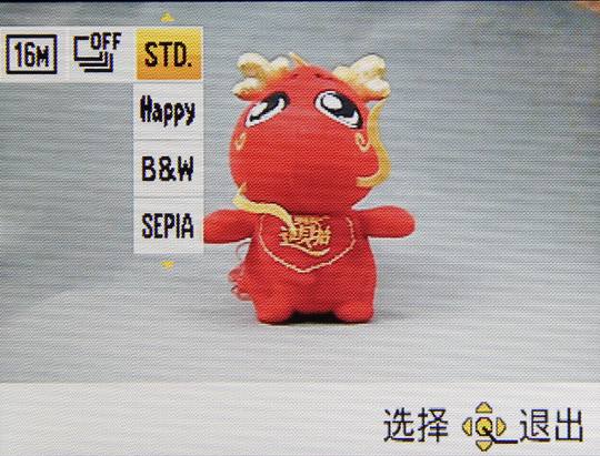 相机背面右下角Q.MENU除了删除作用,还有快速菜单作用,按下该按钮可以对图片的像素、ISO、AF模式、白平衡、连拍、色彩模式、LCD模式、短片分辨率等进行调整(标准拍摄模式下可调节项目最多)。其中色彩模式包括标准、黑白、深棕色、鲜艳(处于标准模式)、快乐(仅限于智能自动模式)
