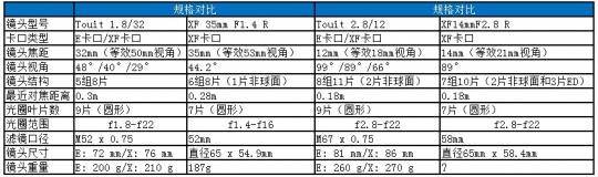 卡尔·蔡司此次发布的Touit 2.8/12和Touit 1.8/32,前者视角达到99°,非常适合用于风景和建筑摄影,后者等效35mm格式焦距约为50mm(标头),适合人像摄影、风景摄影或抓拍。与它们规格类似的有富士XF 35mm F1.4 R、XF 14mm F2.8 R,索尼E 35mm F1.8.OSS、E 16mm F2.8。我们不妨将卡尔·蔡司的两支副厂镜头与富士原厂进行规格对比:
