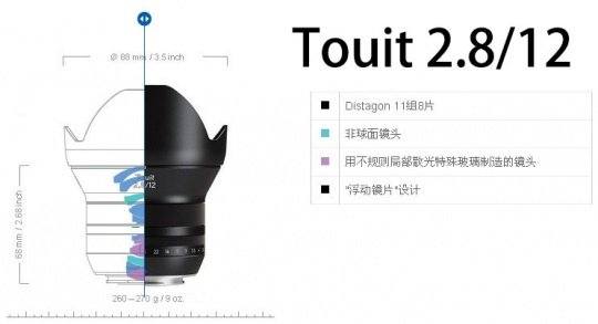 Touit 2.8/12采用11片8组镜头结构(含2枚非球面镜)、浮动镜片设计。非球面镜片设计可以减少或消除球面像差和其他光学像差,确保了影像可在整个调焦范围从中心到边缘均有锐利的图像。所谓浮动镜片补偿像差技术,是一种通过改变镜头内各个镜片或镜组的轴向距离,局部调整镜片在调焦时向像差小的方向移动从而使光线偏差和影像变形得到精细矫正的技术。