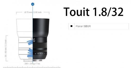 Planar是双高斯对称型镜头,该结构的特点是色差修正完善,对称设计,变形极低。主要用在标准镜头上。Touit 1.8/32采用8片5组镜头结构,该结构是通过修改技术成熟的6片基本结构而来。