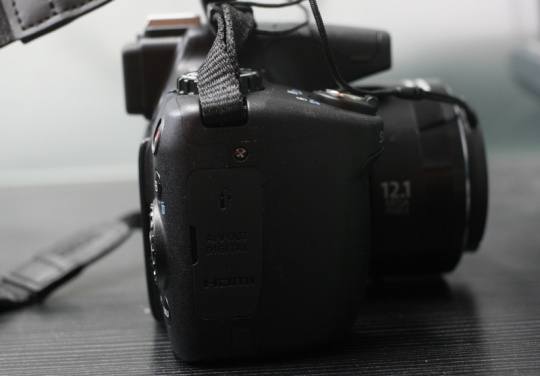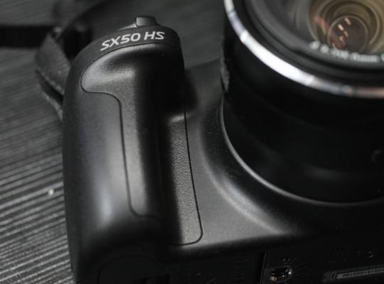 在机身的右侧也有跟单反一样的手柄。由于机身较小的缘故,SX 50 HS的手柄也相对较短,一只手不能完全的握住机器,尤其是小拇指比较便扭。为了增加握持感,最好两只手同时抓握机器。在手柄的最上面标明了机器的型号。