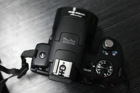 SX 50 HS的顶部主要融合了相机闪光模式按钮、外闪热靴、电源开关、快门与模式转盘等。佳能还特别为这款长焦机器配备了可以接驳外置闪光灯的热靴,这也为机器提供了更广阔拍摄空间。