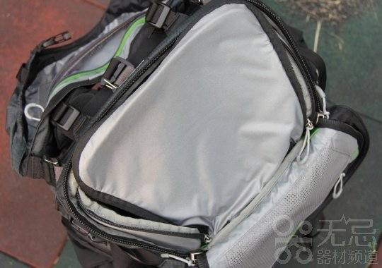 当我们打开背部拉锁,里面的内胆包就呈现出来,不过要想取用器材,还得再拉开内胆包拉链。虽然看上去有点繁琐,但的确可以很好防止意外的发生。