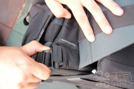 在包的左侧笔者发现有一个侧部背囊拉锁。可以很方便的拉开,里面的空间不算很大,可以放一些小物件,比如手机充电器啊。读卡器啊或者电池一类的。在左侧的底部还有一个机关,在包的最底部有一个腰包的隐藏空间,如果想把隐藏的腰包拿出,就需要在左侧底部打开收放开关。