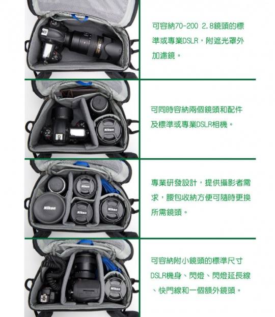 另一种选择是DSLR相机移至背包的主层,进行拍摄时可立即使用腰包替换所需的镜头(见图三结构配置)腰包最大的容量,可放多颗镜头。