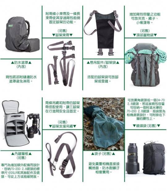 180o专业摄影登山包让摄影师在摄影领域维持最大的创造力,因為这个背包不需卸下,摄影师可以继续登山攀岩及步行,相较於把背包重覆地背上卸下的动作,摄影师能更加专注在拍摄上,除此之外,相对地也减少敏感的相机器材接触到灰尘,泥土,水和沙的机会。