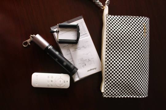 富图宝自拍套件包括一个BT-3的遥控器,一个EP-2迷你三脚架,还有一个漂亮的多功能手包,我分别在IPHONE和IPAD上试了试,总体比较满意。