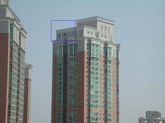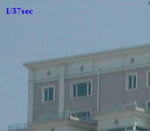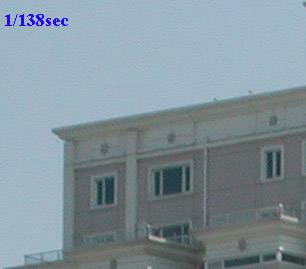 虽然是用数码相机,在自己的实际拍摄中常常安照135胶卷相机的倒数律来指导快门速度的选择。然而由于傻瓜式数码相机和135 SLR相机在设计上的许多不同,决定了它们的规律应该不相同。为了更好地活用手中的990,简单测试了一下不同快门速度拍摄的同一物体。下面是测试990在长焦端(110mm)的拍摄画面。蓝框内是下面比较的局部原尺寸画面。