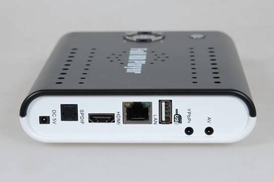 机身后方有外置5V直流电源插口,SPDIF光纤插口,HDMI接口,百兆以太网接口,USB接口,分量视频插口,音频插口。