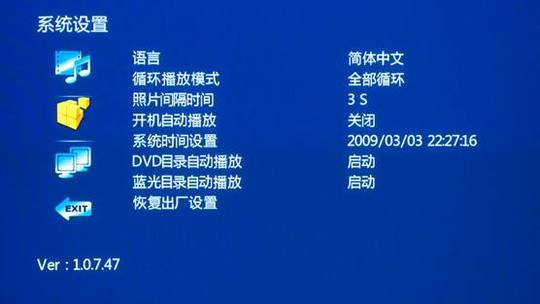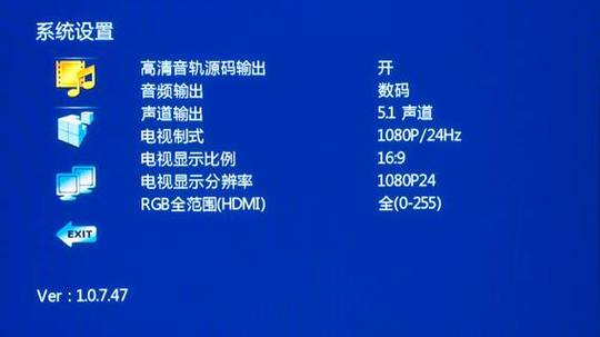 系统设定比较简单,音频部分可以选择是否输出高清音轨源码等,而视频部分也比较简单。首次开机的默认设置是1080i,如果连接电视后看不到显示可以连续按遥控上面的视频输出,等待电视循环到相匹配的模式后再进入设置菜单选择最佳配置。