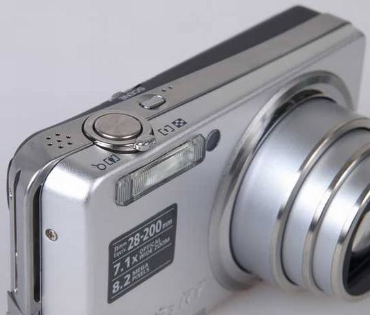 机身顶部是电源开关和快门按钮,变焦杆采用环绕快门式设计,力度适中,使用起来比较顺手,在回放的状态下变焦杆用来控制图像的放大与缩小。电源开关和快门按钮旁边各有几个小孔,都是发声喇叭,但是电源开关边上的两个小孔喇叭几乎没有什么作用。