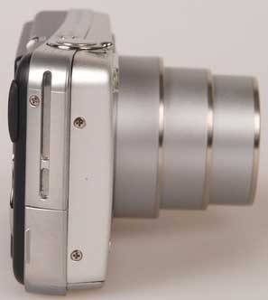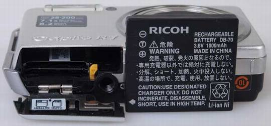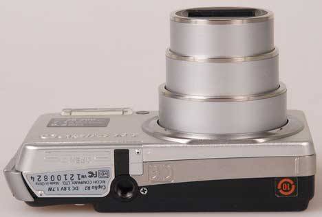 机身前面设计的比较简洁,硕大的7.1倍光学变焦镜头占据了前面一半的空间,这支镜头的135等效焦距为28-200mm,和以前产品的指标一样,光圈范围f/3.3-5.2,1cm微距功能也始终保持着。不过从R6开始,这个系列在场景模式中又增加了一项叫做变焦特写的功能,实际上就是超级微距功能,不过这个功能只能在广角端实现,在使用变焦特写功能时相机是不能提供变焦的。这支镜头还是采用了理光引以为豪的双回缩系统,这种后组镜头可移动的设计保证了该系列相机在使用大变焦比镜头的同时还能够保持小巧的身材。镜头的左上侧是闪光灯和对焦辅助灯,这个系列相机的闪光灯在全光输出的时候光量非常大,在近距离使用时要特别注意,要多使用几次才能掌握好拍摄距离、焦距与闪光量的比例。下面黑色铭牌上标注了这款相机的特色:28-200mm焦距、7.1倍光学变焦、820万像素CCD。