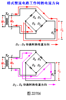 桥式整流的工作原理如图Z0706所示。在u2的正半周,D1、D3导通,D2、D4截止,由TR次级上端经D1→ RL →D3回到TR 次级下端,在负载RL上得到一半波整流。
