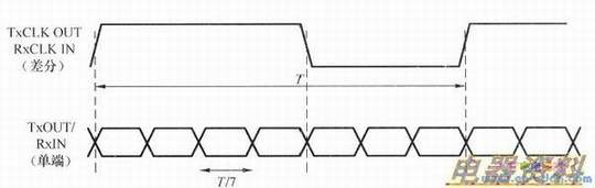 LVDS发送IC在一个时钟脉冲内,每个数据通道都输出7位的串行数据信号,也就是说LVDS发送IC以3.5倍的输入时钟频率输出数据,如下图所示。