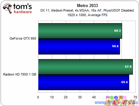 《地铁2033》测试中Windows 8终于给力了一次,GTX 660在Windows 8中的表现领先Windows 7接近2帧,而HD 7850则达到了2.5帧,终于让人看到了Windows 8的希望所在。