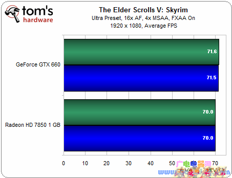 《上古卷轴5:天际》测试中,Windows 8与Windows 7中两款显卡的表现还是没有什么差距。