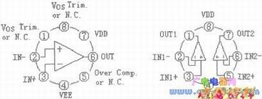 运放的引脚排列现在已经标准化了,运放的型号不同,其引脚的功能看排列一般是完全相同的,从安装的角度讲同样尺寸封装的不同型号的运放是可以直接互换的,不过互换时要注意运放的性能是否能够满足电路的需要。上图是常见的双列直插运放的引脚图(N.C.表示空脚,下同),下图是常见运放的外形图。