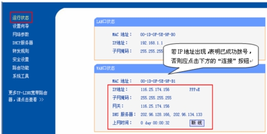 3、拨号的连接或断开操作可通过点击管理界面左侧边栏框中“运行状态”栏,点击右框“WAN口状态”中的连接/断开按钮来实现。
